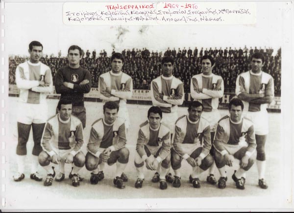 Panathinaikos won its 10th title. Standing from left: Aristides Kamaras, Takis Iconomopoulos, Mitsos Dimitriou, Giannis Tomaras, Frangiscos Sourpis, Kostas Athanasopoulos. Crouching: Giorgos Deligiannis, Kostas Eleftherakis, Antonis Andoniadis, Mimis Domazos, Haris Grammos.